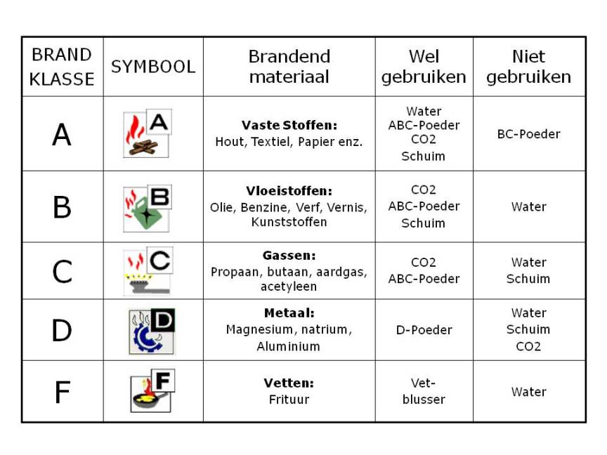 Maar bij het blussen van een brand moet u er wel rekening mee houden dat u de juiste blusstof gebruikt voor de op dat moment brandende materialen. Het juiste blusmiddel in huis hebben is daarom van belang. Het onderscheid hierin wordt aangegeven door de verschillende brandklassen. U voorkomt zo veel onnodige nevenschade na het blussen van een kleine brand.